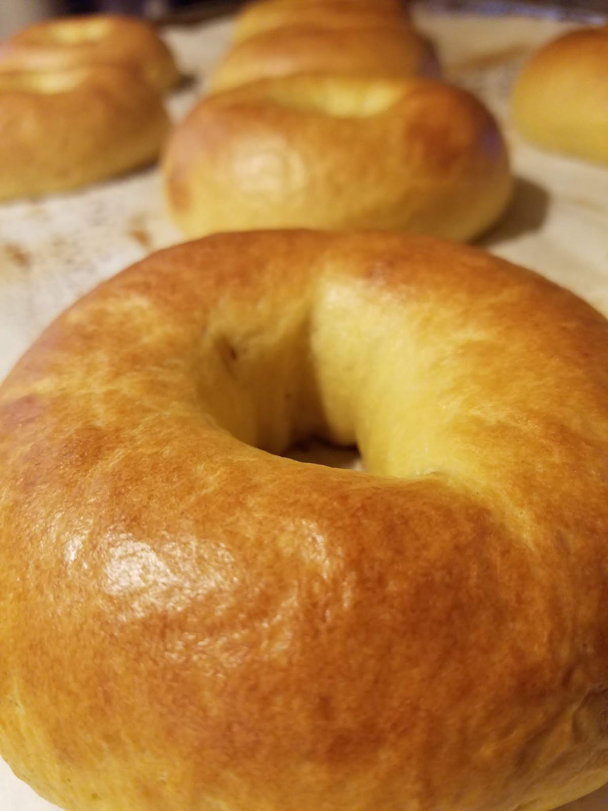 13. Bake for 8 mins, then rotate the pan. If the bottoms of the bagels are browning too much, you can at this time place the baking sheet on top of an empty baking sheet to insulate the bottom. Bake for another 6-8 mins until golden.