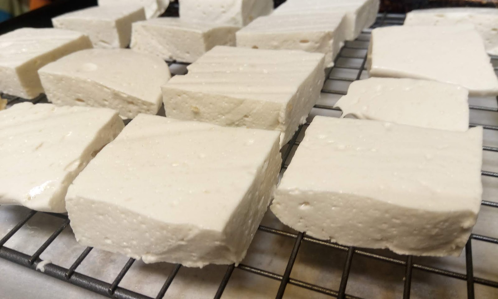 6. Once fully cool, lightly grease the top of the marshmallow. Cut into 2x2 squares and transfer to a cooling rack. Let dry at room temperature for at least 12 hours.