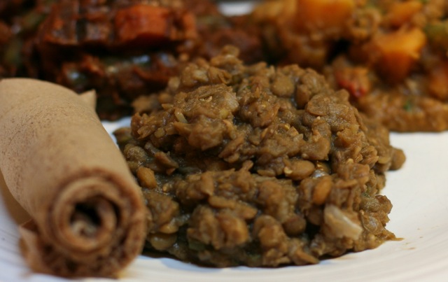 1. Rinse lentils then place in a large saucepan with water, onions, garlic, and chile. Bring to bubbling, then reduce heat to low, cover, and simmer for about 45 mins, until lentils and soft and onions have more or less disintegrated. Stir periodically and add more water if needed.