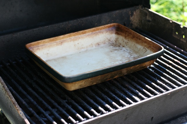 I then replaced the grill and put a clay dish on top to raise the baking stone off the grill a bit. This way the stone does not get too hot and burns the bottom of the bread before the loaf is done. You could also use metal cans or something else fireproof. Just make sure not to raise the stone too much--you need room for the bread to rise.