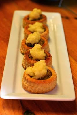 7. Fill vol-au-vent while mixture is still warm. Top with ginger applesauce and serve.