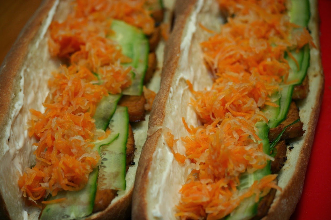 Here is part two of my 2-part series on making Banh Mi for a holiday (or some other kind of) party. Now that you have your baguettes fresh from the oven, it's time to top them and eat! This recipe makes a lot, so if it is just for you, cut the tofu and marinade in half. You can get away with marinading the tofu, and picking the carrot/daikon, for a few hours, but it all tastes better if you make it the day before. You will have some tofu left over, so just save it for tomorrow.
